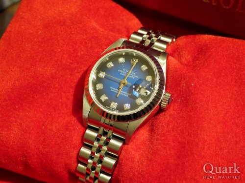 S様 この度はクォーク横浜店をご利用くださいまして誠にありがとうございます。こちらのモデルは、ダイヤル中央から外周にかけて濃淡を変えるブルーのグラデーションダイヤル、そして10Pダイヤモンドが眩く輝く本当に綺麗なお時計です。人気がありながらも生産終了となってしまったダイヤルでございますので、タイミング良くS様にご覧いただき私としても本当に嬉しく思います。お使いいただいて何かご不明な点等ございましたらお気軽にご相談ください。今後とも末永いお付き合いの程、宜しくお願い致します。