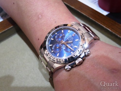 O様 この度は数ある時計店の中からクォーク上野本店をご利用頂き誠にありがとうございます。今回はDAYTONA Ref.116509ブルーダイヤルのご購入のお手伝いが出来た事、大変嬉しく思います。ケースからブレスレットまで全てに18KWGが使用され、重厚な高級感を演出するデイトナRef.116509です。O様が仰る様に、鮮やかな深いブルーのダイヤルが上品な高級感を感じさせ、スポーツモデル最高峰の存在感を楽しめる1本です。ご使用頂きしっかりとサポートさせて頂きますので今後、お時計の事で何かございましたらお気軽にご相談下さいませ。宜しくお願いいたします。