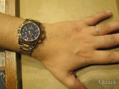 M様、この度はクォーク梅田店をご利用頂きまして誠に有難うございます。ご満足頂けるモデルを提案させて頂く事が出来て大変光栄でございます。今回お選び頂いたデイトナ Ref.116523ブルーアラビアダイヤルは現在生産していない仕様となっております。流通も少ないモデルの為、注目度も高くきっとご満足頂けると思います。使用方法等ご不明点がございましたらしっかりとサポートさせて頂きますので、末永いお付き合いの程宜しくお願い致します。またのご来店を心よりお待ちしております。
