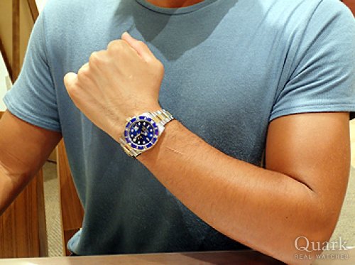 ROLEXの購入はテレビの影響。芸能人でROLEXの時計を着けている方に目が行くようになり、いつかは自分も欲しいと思った。もともとブルー色は好きで、青サブに興味はありましたが、実物を拝見してその青サブ独特の色合いに惚れて直ぐに購入を決めました。