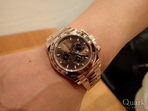K様、この度はクォーク神戸店をご利用頂きまして誠に有難うございました。日頃よりご贔屓下さり心より感謝を申し上げます。今回ご購入頂きました Ref.116505(茶黒目)は、2008年から生産されているオールPG仕様のデイトナです。こちらの色目は2019年からの新色で、発売当初から大人気です。全体の配色バランスが絶妙で、上品さとカッコ良さを兼ね備えた最高のモデルです。K様のお召し物や雰囲気にもマッチされていて、とてもお似合いでございました。末永くご愛用頂けましたら幸いです。今後もご指名頂けますようしっかりとサポートをさせて頂きます。何かご要望などございましたら、私井内までお気軽にお申し付けくださいませ。また、ブレスレットの洗浄及び調整も無料で行っておりますので、お近くに来られた際には是非共遊びにいらして下さい。心よりお待ち致しております。 クォーク神戸店 井内