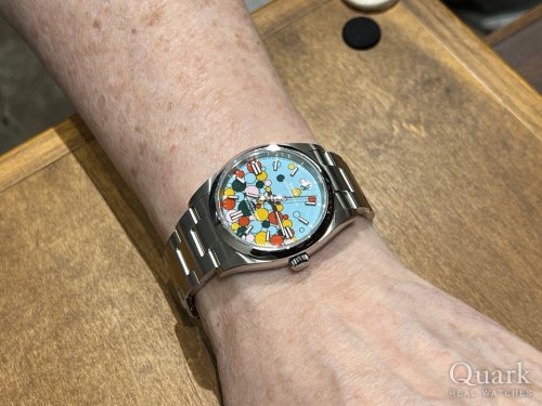 I様 この度はクォーク静岡店にて御時計をご購入いただき、誠に有難うございます。ご家族でご来店くださいましたI様。2周年記念セール特価品としてご用意したオイスターパーペチュアル(Ref.126000)セレブレーションモチーフをご購入いただきました。セレブレーションモチーフは5色のカラフルなドットがランダムに配置されたデザイン性溢れる文字盤が魅力で、流通量も非常に少なく希少モデルでもあります。コメントに一目惚れといただきましたが、出会いの1本となりましたね。是非末永くご愛用いただけましたら幸いでございます。