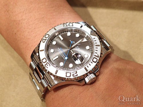 M様、この度はクォーク福岡店をご利用いただき誠に有難うございます。お買い上げ頂きました『YACHT-MASTER/Ref.116622』はプラチナならではの高級感に溢れるデザインに光の加減で様々な表情を見せるダークロジウムダイヤルと水色の秒針やモデル表記がアクセントとなっている魅力満載のお時計です。