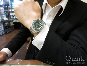 T様 この度はクォーク心斎橋店をご利用頂き、誠に有難うございました。ご購入頂いたグリーンサブとお悩みになられていた青黒ベゼルのGMTマスターⅡは共に色使いに特徴があり、どちらも魅力的で悩みの種になりますね。最終的に決め手となったグリーンサブの文字盤は光の当たり方で色目が変わる、独特な光沢感を持っています。様々な場面で様々な表情を見せ、きっとT様に愛着を思って頂ける1本になると思います。永くご愛用頂けますよう、しっかりとサポート致しますので何でもご相談ください。有難うございました。