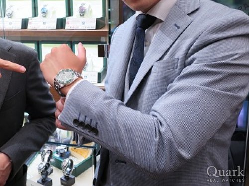 この度は、クォーク横浜店にご来店ならびにご購入頂きまして誠にありがとうございました。M様の品格のあるスーツ姿と立ち振る舞いは同じ接客業として勉強になりました。他のモデルとも悩んでおりましたが、ロレックス初のカラーセラミックを採用した革新的なグリーンサブは、M様の雰囲気やお仕事内容にもピッタリなお時計です。これを着けてお仕事がんばって頂けたら嬉しい限りです。ご遠方ではございますが、何かお時計の事でご相談などがございましたら、お気軽にお問合せ下さいませ。今後ともよろしくお願い致します。
