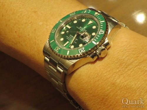 I様 この度はクォーク横浜店をご利用頂き、誠にありがとうございます。流通量の少ないグリーンサブですが、たまたまお越し頂いたタイミングでご案内でき、嬉しく思います。何といっても目を引く鮮やかなグリーンカラーは、見る角度により様々な表情を見せ、ユーザーを楽しませます。永くご愛用下されば幸いです。今後は日々のお手入れから定期的なメンテナンスまで、I様の時計をサポート致しますので、近くまでお越しの際はお気軽にお立ち寄り下さいませ。今後とも末永いお付き合いの程、宜しくお願い致します。