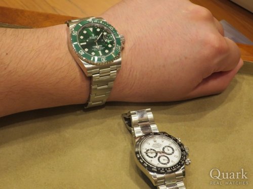 ご購入いただきましたグリーンサブマリーナーは大変人気が高く、流通量も少ないので憧れを抱いている方の多いモデルでございます。デイトナのホワイトダイヤルをご購入されてから2週間後にグリーンサブマリーナーを手に入れられたT様を大変羨ましく思います。T様のお持ちの2本とも入手困難で、人気も高いお時計でございますので、末永くお使いいただけましたら幸いでございます。