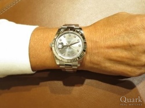 S様 この度はクォーク梅田店ご来店並びにご利用頂き誠に有難う御座います。お下取致しましたモデルと比べて、5㎜サイズアップしたので付け心地の違いも楽しめると思います。グレーの文字盤が統一感を生み、ダイヤとの相性も抜群!お時計の状態を含めてとても良いタイミングだと思います。同デザインながら違いを楽しめる良いお買い替えですね☆今後とも宜しくお願い致します。 クォーク梅田店 平田
