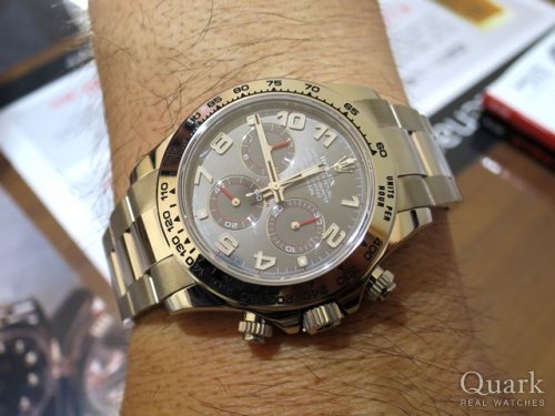 M様、この度はクォーク上野本店をご利用いただきまして誠に有難うございます。令和の時代に入り、上野本店での記念すべき第一本目でございます。お選び頂きました18金ホワイトゴールド無垢のデイトナは市場の流通量が少なく、今回タイミング良くM様にご案内できて私も嬉しく思っております。現行モデルには無いグレーアラビア文字盤に赤針が非常に良くマッチしていますね。次回のご購入の際も、私がお手伝いさせていただけましたら幸いです。今後とも末永いお付き合いの程、よろしくお願い申し上げます。