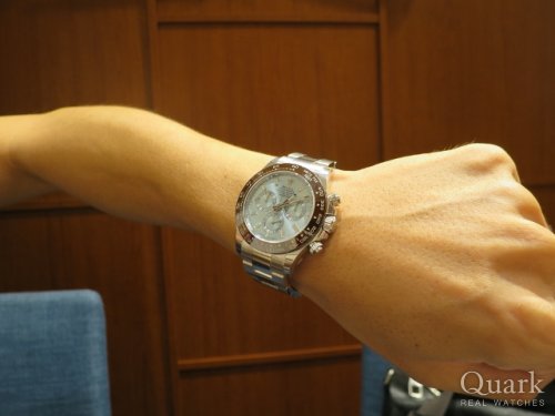 S様、いつもクォーク梅田店をご利用頂きまして誠に有難うございます。アイスブルーダイヤルがとても眩しいですね。今回お選び頂いたデイトナ Ref.116506Aはプラチナの無垢素材に加え、8Pのバケットダイヤがセッティングされており、格別の高級感が漂いますね。ズッシリとくる重厚感もプラチナ特有となりますので是非末永くご愛用くださいませ。また良いモデルがあればご案内させて頂きますので宜しくお願い致します。