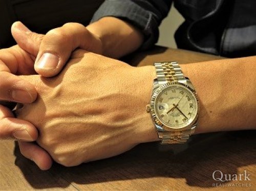 この度は、クォーク横浜店にご来店ならびにご購入いただきまして誠にありがとうございました。当初ご検討いただいていたホワイトローマがなかなか見つからずお時間をいただきましたが、今回お選びいただいたアイボリーピラミッドは、落ち着いたオフホワイトと凹凸のあるデザインが他の文字盤よりも凝った造りで、デザイン性の高さと品格を感じる文字盤です。U様の雰囲気にも腕元にも大変似合っておりました。これまでのデイトジャストと印象はガラっと変わりますので、また新たな気持ちでロレックスをお楽しみいただけると思います。白系の文字盤の時間の見やすさも時計選びのポイントになったとの事で、そのお話を聞いてとても納得させられました。是非、こちらのアイボリーピラミッドローマをご使用いただいての感想をお聞かせくださいませ。またブレス洗浄などでお店にお越しいただける日を楽しみにしております。今後ともよろしくお願いいたします。 クォーク横浜店 長本