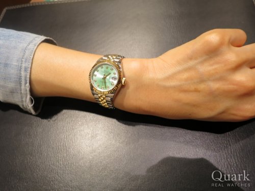 M様、この度はクォーク梅田店をご利用頂きまして誠に有難うございます。一目惚れされたミントグリーンダイヤルはとても美しいお色目ですね。M様のお人柄や雰囲気にもとてもマッチしていてピッタリだと思います。長く安心してご愛用して頂けるようにしっかりとサポートさせて頂きますので、ご不明な点などございましたらお気軽に仰ってくださいませ。またのご来店を心よりお待ちしております。