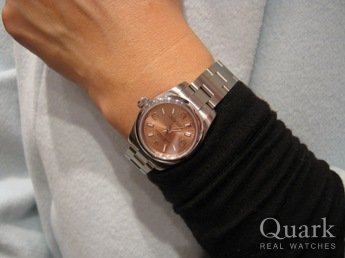 ご購入頂きました時計は、日付が無いので文字盤がスッキリしている分ピンクの文字盤が良く引き立つと思います。色んな洋服にもさし色として使って頂けるので使い分けを楽しんで下さい。アフターサービスも行っておりますのでいつでもお気軽にご来店頂ければ幸いです。