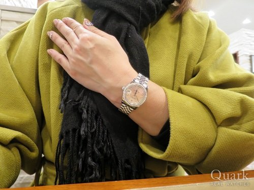 S様 この度はクォークなんば店をご利用頂き、誠に有難うございます。お買い求め頂きましたRef.178384Gは文字盤には10Pダイヤが、加えてベゼルにもダイヤモンドを均一にセットした豪華な仕様となっております。ケースやブレスレットはシルバー色で統一されており、嫌みなくダイヤモンドを引き立ててくれる上品な1本に纏っております。明るすぎず落ち着いた色目のピンク文字盤は可愛らしさも感じさせ、組み合わせも抜群でございますね。S様の雰囲気にもピッタリな1本かと存じますので、末永くご愛用頂ければ幸いでございます。サイズ調整や何か気になること等ございましたら、いつでもご相談ください。今後ともクォークを宜しくお願いいたします。 クォークなんば店 鈴木