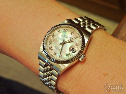H様 この度はクォーク横浜店をご利用いただき誠にありがとうございます。お選びいただいたデイトジャストですが、ボーイズサイズとなりますので視認性が高く、またラグジュアリー感も強く感じられるデザインとなっております。ピンクシェルも華やかな雰囲気ですし、独特な模様のデコレーション仕様は現在のモデルにはございませんので、併せてお楽しみください。今後とも末永いお付き合いのほど、宜しくお願い申し上げます。