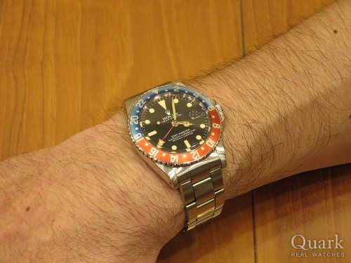 今まで愛用していたRef.1655を手放し、やはり腕周りが寂しくなってしまいました。子供の頃見ていたドラマの俳優が着けていた腕時計をカッコイイと思っていましたが、再放送を見たのがきっかけで気持ちが再燃し、GMTが欲しくなってしまいました。生まれ年に近い個体を探していましたが、雰囲気の良い個体が見つかり、今回の購入に至りました。