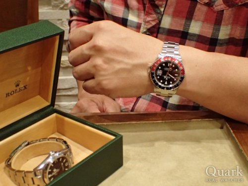 G様 この度は、私共クォークをご利用頂き、誠に有難う御座いました。また、ご来店日のご都合も合わせて頂き、重ねて御礼申し上げます。赤青ベゼルのGMT-MASTER II は、2007年のモデルチェンジの後、人気急上昇のモデルで御座いましたが、今年、新型のSSモデル・赤青ベゼルが発表された事で、更に注目が集まっている話題のモデルで御座います。今後の動向も含め、付属していた別のお色へのベゼル交換等、これからも様々な点で楽しんで頂ける事と存じます。現在ご使用のモデルと全く違う雰囲気と機能をもったモデルで御座いますので、これまでとは違った新しいROLEXの魅力をご堪能頂けましたら幸いです。また、その、GMT-MASTER II の機能で御座いますが、ROLEX唯一のパイロットウォッチとなり、3か国の時間表示が可能で御座います。海外に行かれる際には、是非ご活用頂きたいと思っておりますが、一度の説明ではなかなか難しいですね。改めて説明させて頂きますので、その際にはご一報ください。ご来店当日は、交通機関も街も混雑し、だいぶお疲れになったのではないでしょうか。次回のご来店予定の日は、それほどではないと思いますので、お気持ち的にもゆっくりご来店頂けるかと思っております。色々な楽しいお話を聞かせてください。心よりお待ち致しております。最後になりましたが、嬉しいお言葉を頂戴し、感激しております。末長くお付き合い頂けますよう、精一杯努めて参ります。今後とも、どうぞ、宜しくお願い致します。 クォーク仙台店 麻生