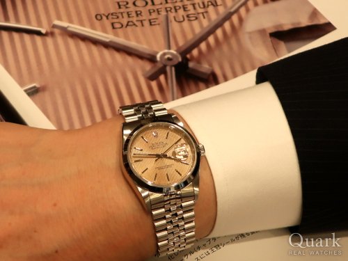 S様、この度はクォーク仙台店をご利用および90’sオークションへのご参加とご落札いただきまして誠にありがとうございます。S様がお選びになられた『Ref.16200』は、1988年~2006年まで生産されていたデイトジャストシリーズで、同モデルのステンレスモデルでは初めてサファイアクリスタルを採用したセミヴィンテージ世代の人気モデルです。また、年々と入荷数が少なくなってきている年代のロレックスのうえ、チャプターリング(ミニッツサークル)仕様のシルバータペストリーダイヤルの個体がちょうどオークションリストにあり、S様がたまたま探されていたダイヤルであったなど、今回S様とは色々なタイミングや偶然が重なり、私としてはご縁をいただいた流れとなります。これから末永くご愛用いただけましたら幸いでございます。尚、ご使用に際して気になる点がございましたら、しっかりサポートさせていただきますので、お気軽にお申し付けくださいませ。どうぞ、今後とも変わらぬご愛顧を賜ります様、よろしくお願い申し上げます。