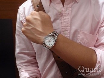 赤い針とカレンダーがアクセントとなる時計ですが、スーツ姿でも私服でもコーディネートしやすいと思います。