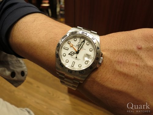 G様 この度はロレックス専門店クォーク広島店にてエクスプローラーII(Ref.216570)白文字盤をお買い求め頂きまして誠に有難うございました。G様のたくましい腕にホワイトダイヤルが映え、エクスプローラーIIがとてもお似合いでいらっしゃったのが印象的です。2か国の時間を把握できる多機能もさることながら、他のモデルとは異った特徴的なデザインもこのモデルの大きな魅力ですね!是非、末永くご愛用頂けます様、願っております。またお使い頂く中でご不明な点やご用命の際にはお気軽にお申し付け下さいませ。今後とも、どうぞ宜しくお願い致します。