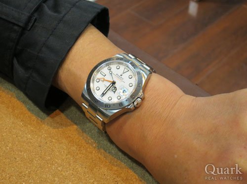 M様、いつもクォーク福岡パルコ店をご贔屓下さり誠にありがとうございます。お求め頂きました『EXPLORER II Ref.216570 ホワイト文字盤』は、インデックス、針のメタル部分が黒く塗装され、文字盤とのコントラストが美しく、視認性に優れた多機能モデルです。M様の素敵なコレクションの1本として、末永くご愛用頂けますようサポートさせて頂きますので、今後ともクォーク福岡パルコ店を宜しくお願い致します。また、カメラのお話し、ナイロンブレスへの変更のご相談を楽しみに致しておりますので、お時間ございましたらいつでも遊びにいらして下さいませ。
