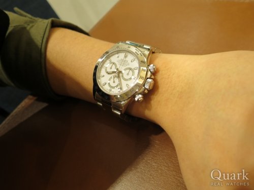 N様、この度はクォーク梅田店をご利用頂きまして誠に有難うございます。今回ご購入頂いたデイトナ Ref.116520ホワイトダイヤルは2016年で生産終了となりましたが、新型モデルとは違った落ち着いた高級感があり、今でも世界中から人気を集めています。スポーツモデルにおいてブラックダイヤルに比べると種類が少ないホワイトダイヤルですが、とても爽やかな印象でお手元が一層明るく華やかになりますね。N様に永くご愛用頂けるようしっかりとサポートさせて頂きますので、何か気になる点などございましたらお気軽にご連絡くださいませ。今後共当店を宜しくお願い致します。