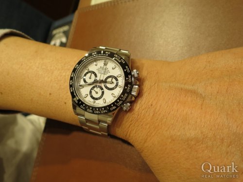 N様、いつもクォーク梅田店をご利用頂きまして誠に有難うございます。今回お選び頂いたデイトナ Ref.116500LN ホワイトダイヤルは2016年に発表された新作モデルで、ベゼルやインダイヤルのデザインが旧型モデルから大きく変わった事で注目を集め、人気を更に高めております。以前より気になられていた同モデルを手に入れて頂くお手伝いが出来て、大変光栄でございます。以前ご使用されていたモデルと操作方法が異なりますが今後ともM様に安心してご愛用頂けるようしっかりとサポートさせて頂きますので、何か気になる点がございましたらお気軽に仰ってくださいませ。またのご来店を心よりお待ちしております。