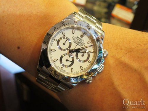 N様 いつもロレックス専門店クォーク上野本店をご利用頂き誠にありがとうございます。今回はDAYTONA Ref.116520ホワイトダイヤルのご購入のお手伝いが出来た事、大変嬉しく思います。N様には2012年と2015年にもRef.116520をご購入頂いておりますが、2016年に生産が終了となり、最終モデルも鏡面バックル対応は非常に数が少なく販売価格も高騰しております。ロレックス社の自社製クロノグラフを搭載した初のクロノグラフデイトナとなり、歴史的な意義が将来的に色褪せることなく今後も高騰していくと思います。使用頂きしっかりとサポートさせて頂きますので今後、お時計の事で何かございましたらお気軽にご相談下さいませ。宜しくお願いいたします。