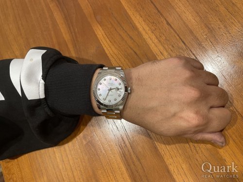 50歳の記念として、ゆくゆくは娘や孫に譲りたいと思い、ロレックスの購入に踏み切りました。もともとロレックスは自分好みでは無かったが、子供に譲る事を考えて、歳を重ねた事で考え方も変わり、ロレックスが魅力的に思えました。当初はブルーダイヤルで検討していたが、シェル文字盤の輝きに魅了されて検討モデルを変更しました。