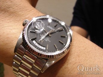 K様 いつも大変お世話になっております。長らくお待たせ致しました!DAY-DATE (Ref.1803WG黒)ようやく納品させていただく事ができて嬉しく思います。今後益々入手困難になってくるのではないでしょうか?今後経年変化も楽しんでいただきながらK様と共に素晴らしい時間が訪れますよう心より願っております。クォーク銀座888店 佐藤