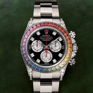 ベゼルにレインボーカラーサファイアをセットした宝飾系のマスターピース、デイトナ・レインボー。生産終了モデル