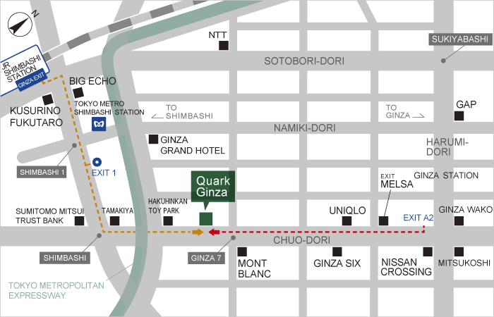 the middle between Ginza St. and Shinbashi St.. Hakuhinkan Toy Park is