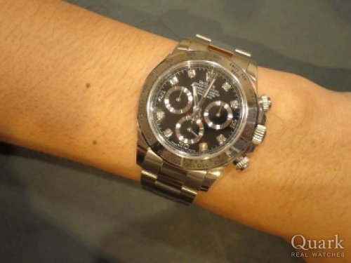 M様 この度は、クォーク梅田店に起こし頂きまして誠にありがとうございます。ステンレスモデルのデイトナとは又違った高級感がございますね。ダイヤ付きでもフェイスがブラックによって引き締まり、より一層ダイヤを輝かせてくれます。これからも長くご愛用して頂ければ幸いです。又気になることがありましたらいつでもお立ち寄り下さい。ありがとうございました。