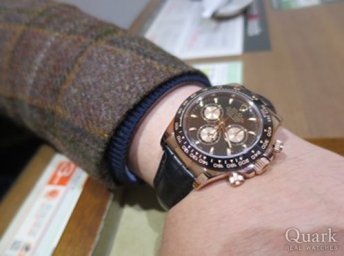 M様、いつもクォークをご利用頂きまして誠に有難うございます。こちらのエバーローズゴールドのデイトナは、ブレスモデルとは異なり、専用のモノブロックブラックセラミックベゼルが、より洗練された印象を出しますね。M様の普段着られる服装ともマッチしていて、非常にお似合いでした!またお勧めのモデルが入荷の際は、ご紹介させて頂きます。この度は誠に有難うございました。