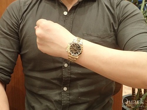 M様 この度はクォーク新宿店をご利用いただきまして誠にありがとうございました。素敵なモデルのご購入をお手伝いする事が出来たこと、本当に嬉しく感じております。デイトナはいつの時代も高い注目度と人気を誇り、金無垢素材と黒色の文字盤の組み合わせは、M様の腕元にはとてもお似合いでございます。是非日頃よりお使いいただきお楽しみください。また、お褒めいただき大変恐縮でございます。M様と色々なお話しが出来てとても嬉しく楽しい時間をありがとうございました。ブレス洗浄やサイズ調整はいつでも無料で致します。お近くへお越しの際には、ぜひお立ち寄り下さい。今後とも末永いお付き合いの程、宜しくお願い申し上げます。