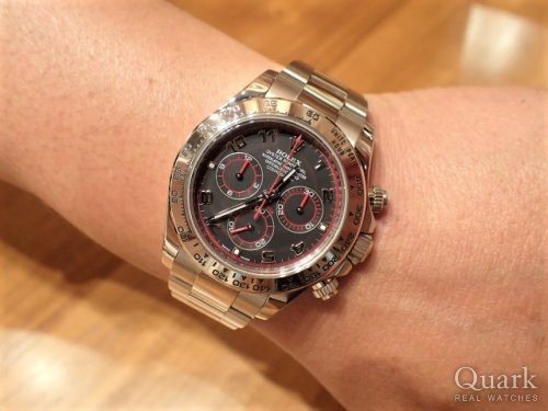 T様、この度はクォーク神戸店をご利用頂きまして誠に有難うございました。日頃よりご贔屓下さり心より感謝を申し上げます。今回ご購入頂きました Ref.116509(黒アラビラ)は、2004年から生産されているオール18KWG仕様のデイトナです。SSモデルと比較するとやや黄色味がかった落ち着いた色味が特徴で、こちらの黒アラビア文字盤は今は廃盤となっております。ゴールドモデルですが、嫌みな派手さは無く様々なシーンでお使い頂けます。ご依頼頂きましてからお時間を頂いてしまいましたが、無事にT様にご案内ができ嬉しく思います。とてもお似合いで素敵でございました。永くご愛用頂けましたら幸いです。今後もご指名頂けますようしっかりとサポートをさせて頂きます。何かご要望などございましたら、私井内までお気軽にお申し付けくださいませ。また、ブレスレットの洗浄及び調整も無料で行っておりますので、お近くに来られた際には是非共遊びにいらして下さい。心よりお待ち致しております。 クォーク神戸店 井内