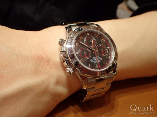 A様 この度はクォーク神戸店をご利用頂きまして、誠にありがとうございます。ご購入頂きましたデイトナはホワイトゴールド素材となっており、ステンレスにはない重厚感が魅力となっております。また、今回お選び頂きましたブラックアラビアはREF.116509のみに用いられた文字盤であり、すでに生産が終了されているため、今後は希少となっていくモデルでもあるかと思います。新品のご購入でもありますので、末永くご愛用頂けましたら幸いでございます。また、近くにお越しの際はお気軽にお立ち寄りください。今後ともクォーク神戸店もよろしくお願い申し上げます。