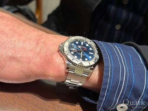 U様 この度は久方ぶりのご来店とお時計のご購入、誠にありがとうございます。今回はお買取と併用とのことで良いタイミングでお時計をご紹介出来ました事、私も嬉しく思います。今回ご購入いただきましたYACHT-MASTERはサブマリーナーと形状が類似しておりますが、より薄型のケースをベースに、プラチナを吹き付けた両回転式のベゼルと仕上げが丁寧な鏡面加工、更に青海を彷彿とさせる深いブルーに帆のような赤い針と、ラグジュアリースポーツらしいユニークな特徴が所狭しとちりばめられている1本となります。サーフィンのお話から海がお好きと拝察しますので、お出かけや旅行などのお供に是非ご利用下さい。ご不明点などございましたら「ほどづか」までお気軽にお問い合わせください。U様のまたのご利用、心よりお待ち申し上げております。