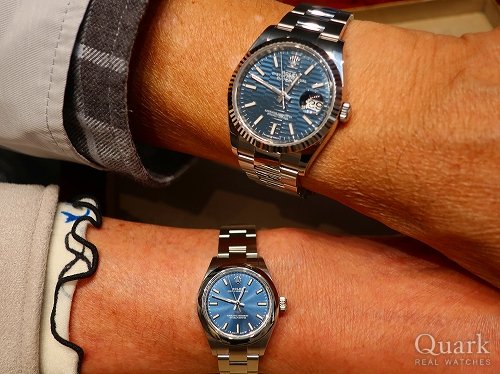K様 この度は、クォーク銀座888店をご利用をいただきまして誠に有難うございます。今回古希の記念と将来子供たちへのお渡しを考えてロレックスをご夫婦でご検討され、その中で文字盤のお色がブライトブルーでお揃いになる「DATEJUST36 Ref.126234」「OYSTERPERPETUAL28 Ref.276200」の2本をまとめてご購入をくださり、本当にありがとうございました。綺麗なブライトブルー文字盤をお気に召していただき、御二人でご試着頂いた際、喜んで頂いている仲睦まじい光景がとても素敵でございました。また、シンプルで高級感溢れるモデルのペアがお似合いでございました。将来お子様達へお渡しの際はきっと喜んでくださり、末永くご愛用できる2本だと思います。ブレス調整から洗浄、オーバーホールなどこれからも大切なお時計のサポートをさせていただきますので、何か気になる点があれば是非いつでも新保までご相談くださいませ。今後も末永いお付き合いの程よろしくお願い致します。クォーク銀座888店 新保