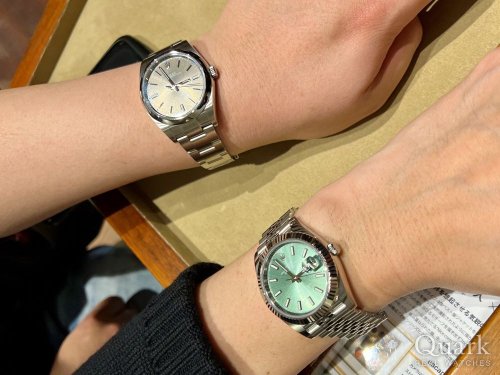 W様 いつもクォーク静岡店をご利用いただき誠にありがとうございます。これほど早くおふたりと再会できたことに驚きを隠しきれませんでした(笑)。太陽光の下でご覧いただくミントグリーンダイヤルはいかがでしょうか?光の当たり具合で色合いが違ってみえるミントグリーンはスーツにも紳士的かつオシャレにみせてくれますね。早速の2本目ロレックスおめでとうございます!!ジュビリーブレスも見た目はもちろん着け心地も変わりますよね。シチュエーションにあわせてご愛用くださいませ。何かご不明点などございましたらお気軽にご相談くださいませ。もちろん、他のブランドのお問合せもお待ちしております♪それではこれからも変わらぬご愛顧を賜りますようよろしくお願い申し上げます。