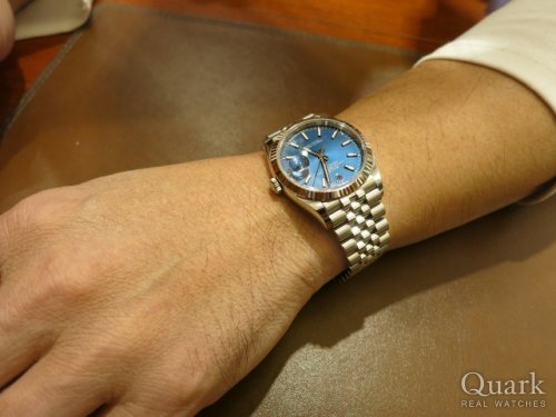 D様、この度は数ある店舗の中からクォーク梅田店へご来店、ご購入頂きましてありがとうございます。ご購入いただきましたRef.126234のブライトブルーダイヤルは落ち着きのある品のあるダイヤルで、どのようなシーンにも合わせられる魅力的な1本でございます。そして誕生日という記念すべき日に、梅田店でご購入いただきまして誠にありがとうございます。是非末永くご愛用いただけましたら幸いでございます。またなにかございましたら、いつでもお申し付けくださいませ。今後ともどうぞよろしくお願いいたします。