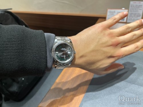この度は数ある時計店からクォーク名古屋駅店をご利用いただき誠にありがとうございます。ご購入いただきました『Ref.126334』スレートローマダイヤルは2019年に発表されたデイトジャストでございます。呼び名はスレートローマの他に『ウィンブルドンモデル』だったり多くの愛称を持つ時計でございます。グレーの文字盤にコーポレートカラーに使用されているグリーンのローマ数字がカッコよくT様にピッタリのお時計になると存じます。また当店でブレス洗浄、タイムチェックも無料で行っておりますので、お近くにお越しの際は遊びにいらしてくださいませ。お使いいただく上で何かご不明な点等ございましたら、また久保までご相談ください。今後とも末永いお付き合いの程よろしくお願いいたします。