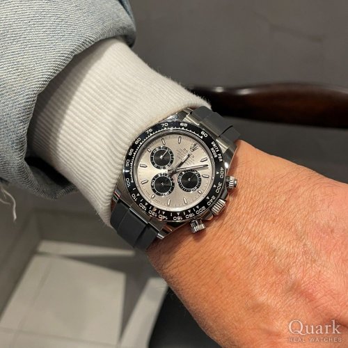 非常感謝您與家人光臨QUARK銀座店,並選擇了這款水泥灰面盤的白金迪通拿。作為目前白金材質迪通拿系列中極具人氣的表款之一,它低調而不失奢華,兼具力量感與優雅氣質,盡顯男士風範。橡膠錶帶配戴舒適,巧妙融合運動感與高級感,無論日常佩戴或特殊場合皆相得益彰。