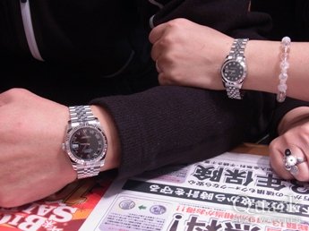 ショップで一目見たときから、このチョコブラウン(6時ダイヤ)に決めていました。再度来店したときには、同じデイトジャストのブラック10Pダイヤと(ほかにシャネル)と悩みましたが、仕事中に着けても上品さと可愛らしさがあり、やっぱり一番最初に気に入ったデザインに決めました。