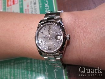 A様 いつも当店を御利用頂き、誠にありがとうございます。シルバーフラワー文字盤は華やかさと高級感を併せ持つ文字盤になりますので、腕元のアクセントとしてピッタリの1本になると思います。これからもしっかりサポートさせて頂きますので、何か気になる事が御座いましたら、御遠慮なく御相談下さいませ。また、お時間が御座いましたら、ブレスクリーニングも兼ねて遊びに来て下さい。 クォーク名古屋店 成田
