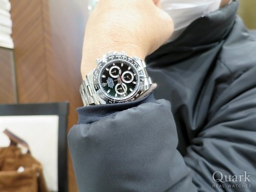 M様 この度はクォーク仙台店をご利用くださいまして誠にありがとうございます。漢気あるM様のご決断の早さに思わず私が驚いてしまいました(笑)。2016年に発表されてから今日まで価格の高騰が激しいデイトナRef.116500LNは、お問い合わせが多いモデルでございます。引き締まったデザインはファッションのアクセントとしても活躍してくれますね!大変お似合いでございます。いただきましたお言葉通り、ぜひいつまでもご愛用いただけましたら幸いでございます。あまりにも素敵過ぎて、お子様にいつの日かおねだりされるかもしれませんね。その前に、おもちゃにされそうで心配ですが・・・(笑)。 すでにロレックスオーナー様としても長いM様なので、心配事はないかもしれませんが、万が一、気になることなどございましたらいつでもご連絡くださいませ。店頭にてブレス洗浄、サイズ調整を無料で承っておりますので、またご家族揃って遊びにきてください♪それでは今後とも末永いお付き合いのほど宜しくお願い申し上げます。