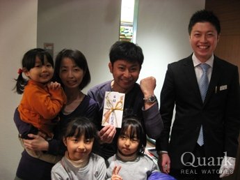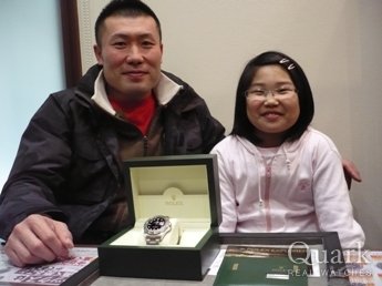 3年前からロレックス購入を検討し始め、モデル選びには悩みましたが、金属ベゼルに数字が刻み込まれているこの独特なデザインが決め手ともなり、 購入致しました。結婚10周年の記念品でもあり、 クォークさんの長期保証に惹かれ購入しましたが、 なんとっビックリ!!新春イベントの10万円が当たっちゃいました!!驚きを隠せない状況の中、店長さんが現金をテーブルまで持ってきて頂いた時ですら、 夢かと・・・。 このロレックスを大事に使い、今後も対応して頂いた副店長の石橋さんにお世話になろうと思います。