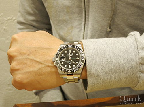 以前にRef.16234を着けていて、クォークさんに売った時思いの外高額で買い取ってくれたから購入もクォークさんと決めていました。Ref.116334黒バーとも迷いましたが、以前も似た時計を着けていたのと、また売る事が合った場合の換金率を考えるとRef.116710LNの方がいいと思い、Ref.116710LNの購入を決めました。
