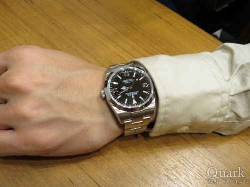 F様 この度は、クォーク神戸店をご利用頂き、誠に有難うございます。ご来店頂いてから、「これ買います!」と決断されるまでが非常に早くて、とても驚きました。F様のコメントでもあるように、エクスプローラーIはシンプルなデザインでありながら、高級感もあり、ロレックスの中でも1・2を争う人気モデルです。スーツスタイルからカジュアルまで幅広く使えるデザインが魅力の一生使える実用モデルですので、是非ご愛用頂ければ幸いです。また、無料でブレス洗浄なども行っておりますのでお近くに来られた際には是非お立ち寄り下さいませ!今後ともクォーク神戸店を宜しくお願い致します。 クォーク神戸店 川田