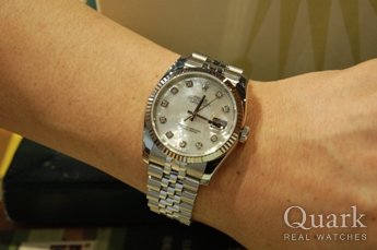 主に仕事用という事もあり、モデルはデイトジャストとだけにしぼり色々なお店を見たのですが、クォーク横浜店にあった10ポイントダイヤのシルバーコンピューター文字盤を一目見て「これだ!」と思い購入を決めました。